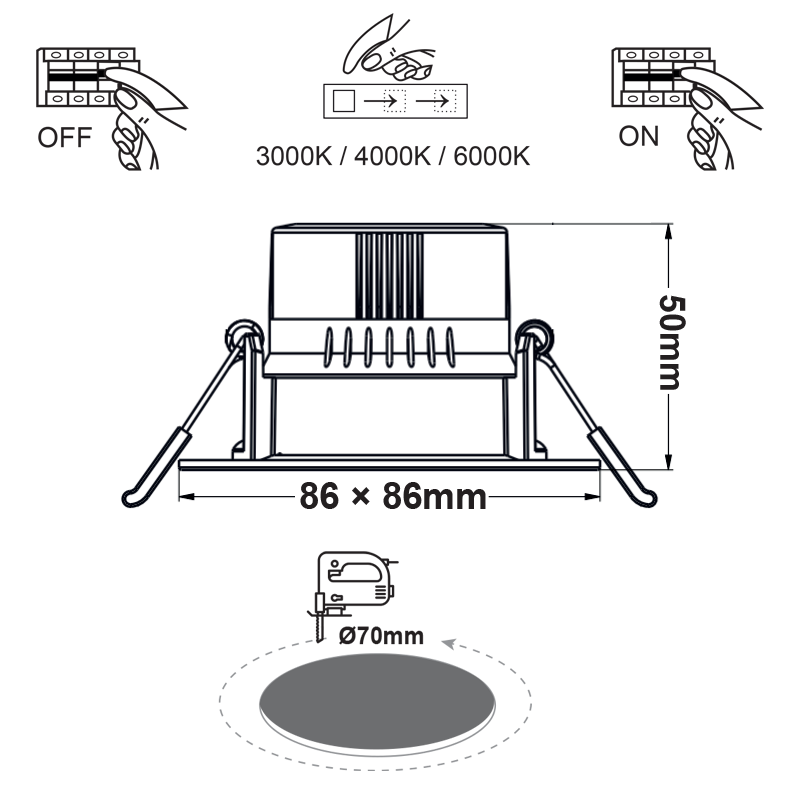 SQUARE LED SPOTLIGHT 7W SWITCH 3000-4000-6000K SMD 230V 40° Ra80 PRE-SET UP 3000K Ν. FALKO7S ΤΗΣ ΕΤΑΙΡΙΑΣ ACA LED LIGHTING Χαρακτηριστικά